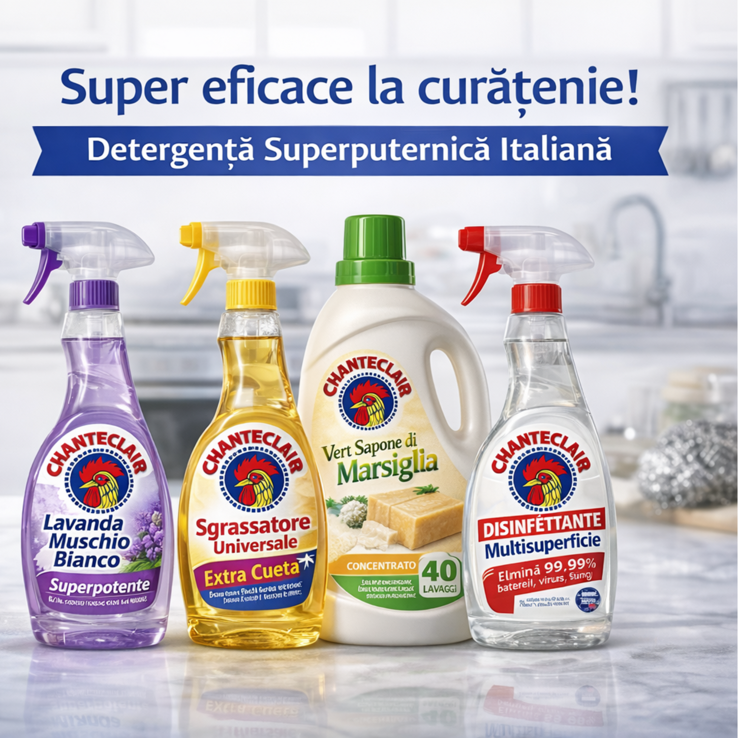 Produse de curățenie Chanteclair recunoscute pentru eficiența lor superioară și calitatea italiană. Formula puternică îndepărtează eficient grăsimea, murdăria și bacteriile, oferind rezultate impecabile pentru întreaga locuință.